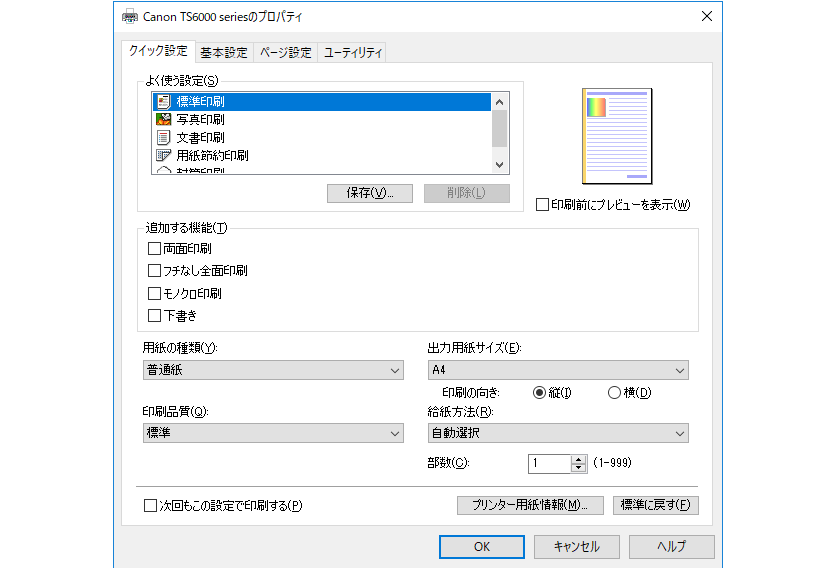 ・印刷を行われたプリンタのメーカー名、型番、ドライババージョンを