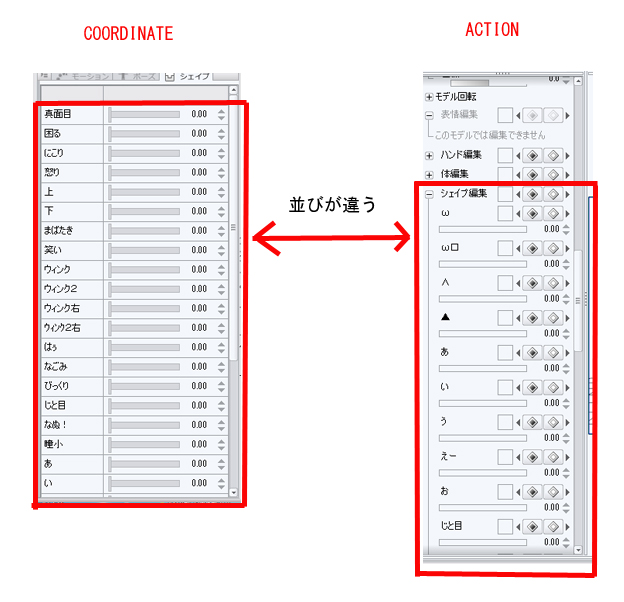 初めて投稿させて頂きます。 PMDデータをCOORDINATEでc2fcに保存して、ACTIONでモデルを読み込んだとき COODINATEのシェイプの並びとACTIONのシェイプ編集の表情データの並びが違っていました。 ACTIONの並びをCOODINATEの並びに合わせる可能でしょうか? 仕様が現状通りでしたら、設定機能で現状の並びとCOORDINATEに合わせる並びとの 切り替え機能を追加頂きたくお願いします。 ![]() ------------------------------------------------------------ ■バージョン:ver 1.1.4 ※[ヘルプ]メニュー→[バージョン情報]で確認できます。 ■OS Windows XP( ) Windows Vista( ) Windows 7 ( 〇 ) Windows 8( ) Windows 8.1( ) MacOS X 10.6( ) MacOS X 10.7( ) MacOS X 10.8( ) MacOS X 10.9( ) その他( ) ------------------------------------------------------------ |