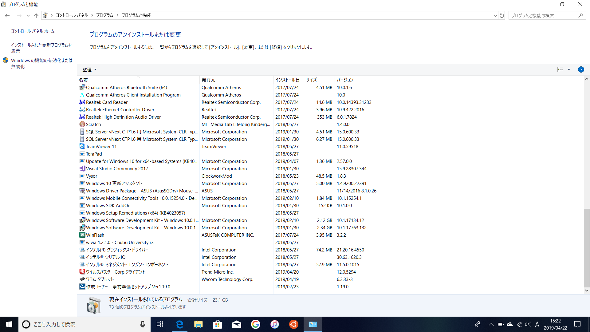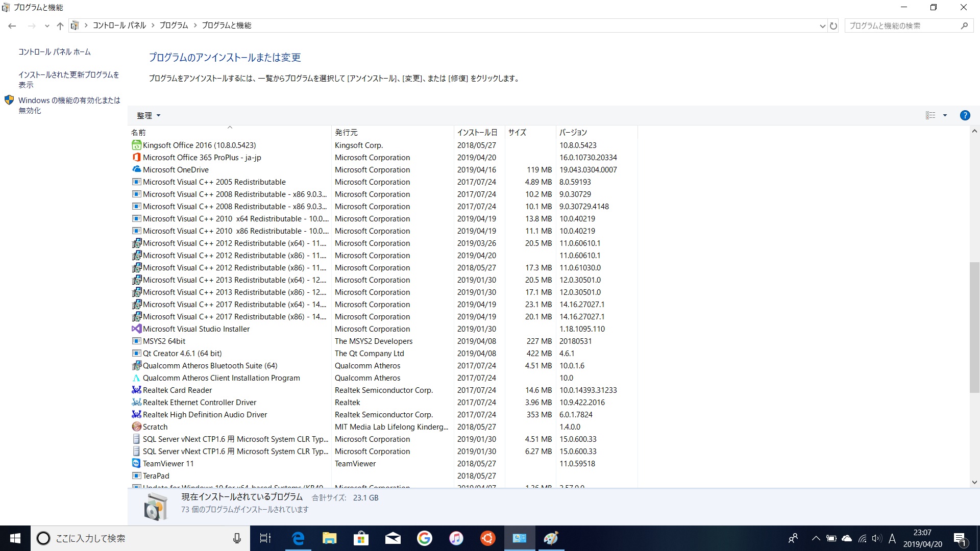 (プログラムと機能)]を選択して表示される画面のすべての項目が
