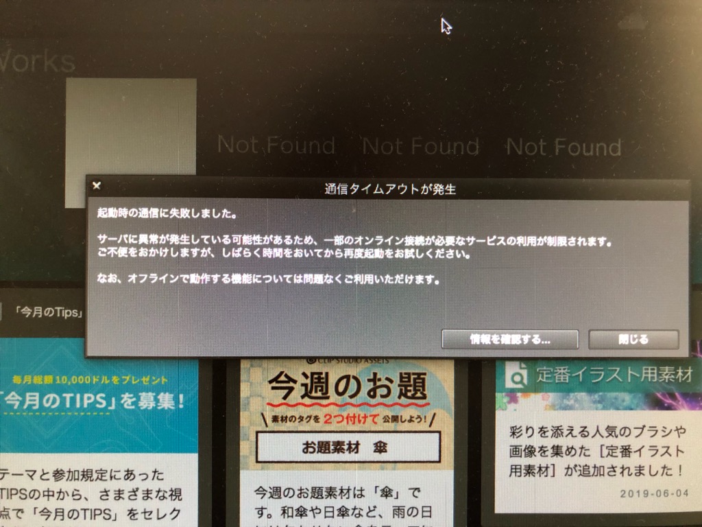 素材のダウンロードなどをしようとすると画像のような画面がでてログインすることができず、フリーズしてしまいまう現象が数日続いています。ペイントの作業はできますが、新しく素材などを入れようとすると同じようにフリーズしてしまいます。解決方法を教えてください。![]() ------------------------------------------------------------ ■バージョン: ※Windows/MacOSXは、右上の[?]アイコンをクリック後に[バージョン情報]で確認できます。 ※iPadは、PAINTの[CLIP STUDIO PAINT]アイコンをクリック後に[バージョン情報]で確認できます。 ■OS Windows 7 ( ) Windows 8( ) Windows 8.1( ) Windows 10( ) MacOS X 10.10( ○ ) MacOS X 10.11( ) macOS 10.12( ) macOS 10.13( ) macOS 10.14( ) iOS 11( ) iOS 12( ) その他( ) ------------------------------------------------------------ |