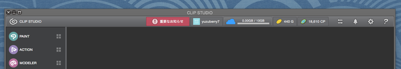 CLIP STUDIOの画面上部のハンドル名が表示されている部分が確認できるよう
