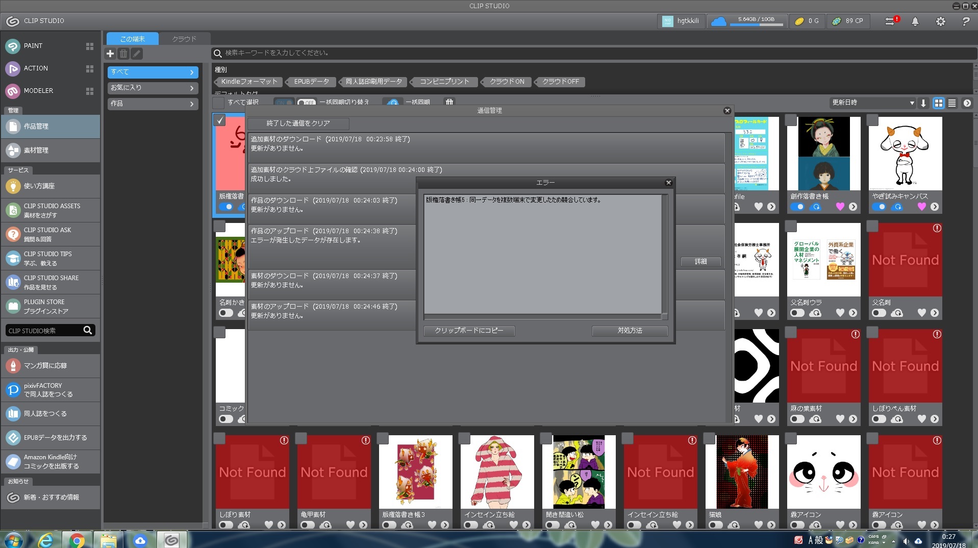 お世話になっております。 以前も複数端末で作業した際の競合の解消について質問させていただきましたが、 今回はメインPCでしか作業していないのに「同一データを複数端末で変更したため競合しています」のメッセージが出てしまいました。 7/17のアップデートをする直前と直後に、違う2つのファイルで同じメッセージが出てしまい、 直前にしたほうのファイルは、書き足したぶんが少し消えてしまいましたがなんとか解決しました。 しかしアプデ直後に試し書きをした別のファイルも同じ症状が出てしまい、質問をさせていただきました。 操作の手順は、作業が終わったらクラウドにアップロードしクリップスタジオを閉じるだけなのですが、 昨日からこのような不具合が起きてしまいました。 いつもと違うことをしたとすれば、クラウドへアップロードが完了した後、すぐまたクリップスタジオを開き少しだけ書き足し、再アップロードするまでの時間がとても短かった(1分から5分程度)くらいなのですが… (普段は再び作業を開始するまで少なくとも数時間から一晩たってからやっています) あまりに頻繁にアップロードを繰り返すとPC本体のデータとクラウドのデータの更新が間に合わない?などのことが起こるのでしょうか…? PCに疎く長々とすみませんがアドバイスのほどよろしくお願いいたします。 PCはwindows7 クリップスタジオEX ver.1.9.2 ------------------------------------------------------------ ■バージョン: ※Windows/MacOSXは、右上の[?]アイコンをクリック後に[バージョン情報]で確認できます。 ※iPadは、PAINTの[CLIP STUDIO PAINT]アイコンをクリック後に[バージョン情報]で確認できます。 ■OS Windows 7 ( 〇 ) Windows 8( ) Windows 8.1( ) Windows 10( ) MacOS X 10.10( ) MacOS X 10.11( ) macOS 10.12( ) macOS 10.13( ) macOS 10.14( ) iOS 11( ) iOS 12( ) その他( ) ------------------------------------------------------------ |