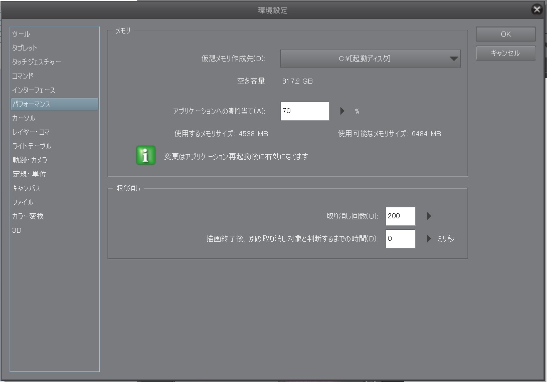過去の質問等を拝見し、自分なりに色々試してみたのですが改善が見られないため お手数ですが解決方法があればお教えいただきたいです。 数日前から突然、下記症状が起こりました。 ①起動時の読み込みが遅い。 今までは数秒で起動していた。今は1分以上かかります。 ②液タブ使用時、ペンでクリックするときの反応がとても遅い。 また、ペンで線を描くとタイムラグが起こり、うまく線が描けない。 →ペン先をつけたまま、長い線や螺旋を描くのはスムーズにできます。 →ペンをつけたり離したりして細かい線を何度も描こうとすると、ペンのタッチ速度についていけずにカクカクしてしまう感じです。 →マウスでクリックするのはタイムラグなく動作します。 ※①については、待てないほどではないのですが、今まですぐに起動していたので気になりました。 こちらは改善しようがないのであれば諦めます 【試したこと】 ・タブレットドライバーのアンインストール、再インストール ・環境設定>タブレット>WinTabをTabletPCへ変更 ・環境設定>タブレット>タブレット設定>速度優先 ・ダウンロードした素材の削除 【使用環境】 ・CLIP STUDIO PAINT PRO バージョン1.9.1 ・東芝 dynabook T75/TBD OS:Windows10 ・WACOM Cintiq Pro13 DTH-1320 ------------------------------------------------------------ ■バージョン: ※Windows/MacOSXは、右上の[?]アイコンをクリック後に[バージョン情報]で確認できます。 ※iPadは、PAINTの[CLIP STUDIO PAINT]アイコンをクリック後に[バージョン情報]で確認できます。 1.9.1 ■OS Windows 7 ( ) Windows 8( ) Windows 8.1( ) Windows 10( 〇 ) MacOS X 10.10( ) MacOS X 10.11( ) macOS 10.12( ) macOS 10.13( ) macOS 10.14( ) iOS 11( ) iOS 12( ) その他( ) ------------------------------------------------------------ |