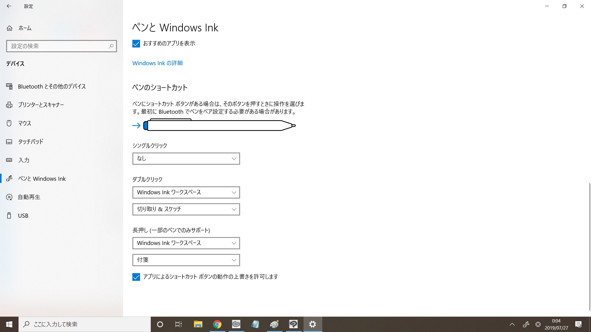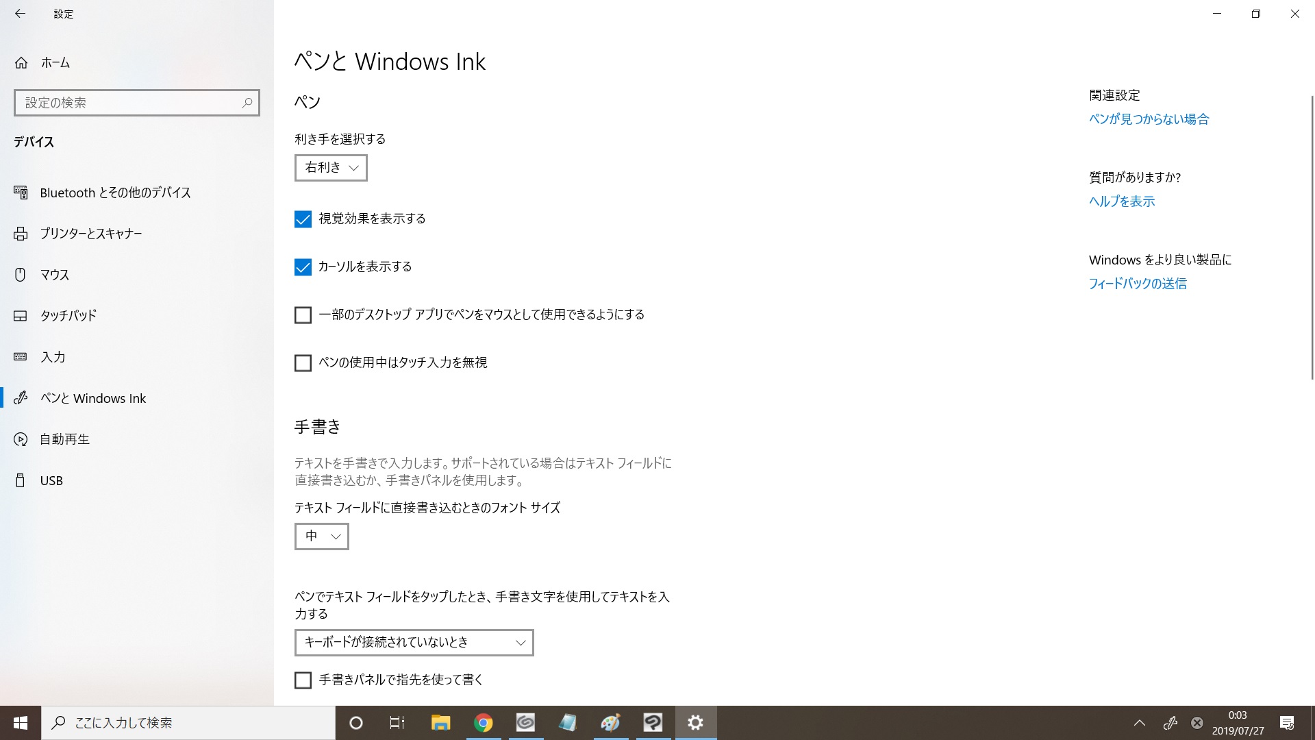 左側で[ペンとWindows Ink]の順に選択すると表示されるページのすべての