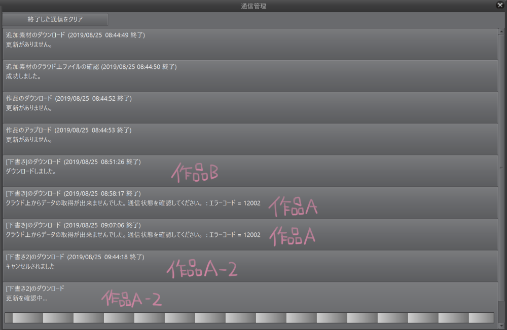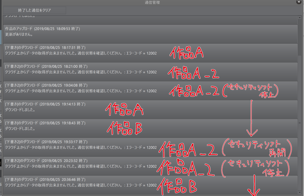 メインPC(有線LAN)とタブレットPC(無線LAN)で交互に作業をしているのですが、昨日から特定の作品(以下、作品A)だけタブレットで【クラウド上からデータの取得ができませんでした。通信状態を確認してください。:エラーコード=12002】と表示されます。 他の作品(作品B)はダウンロードできました。