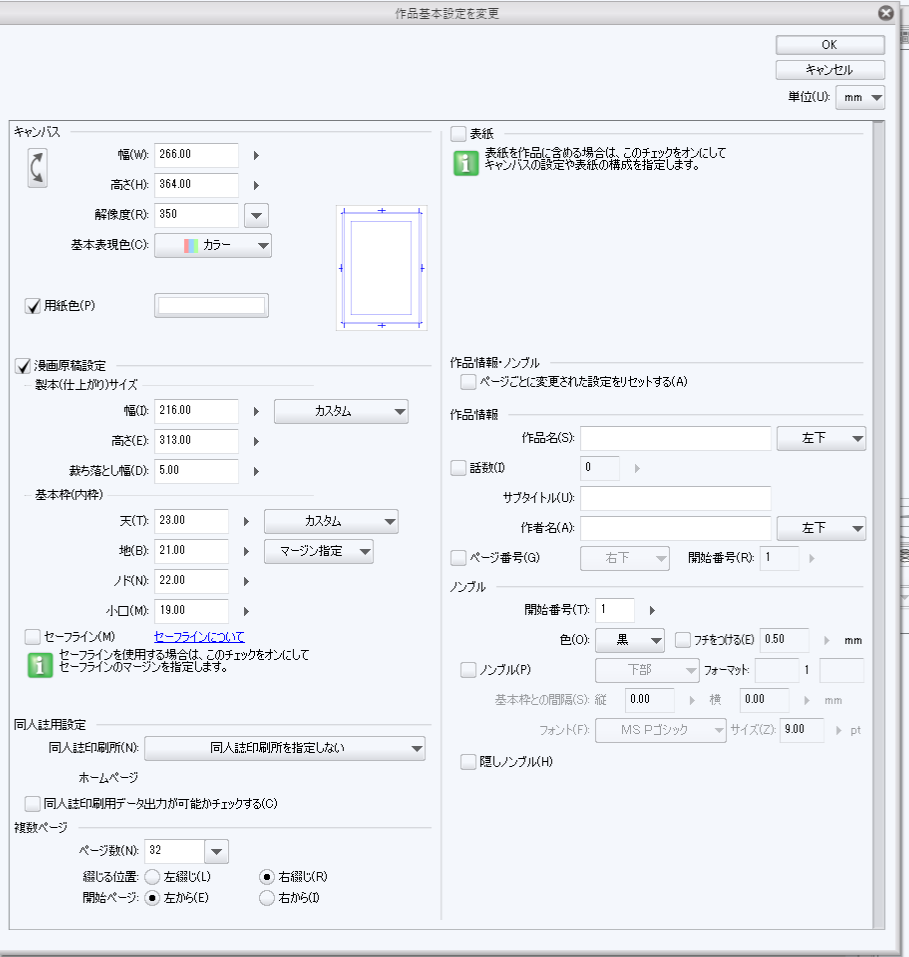 [作品基本設定の変更]を選択して表示される画面と、その作品にて
