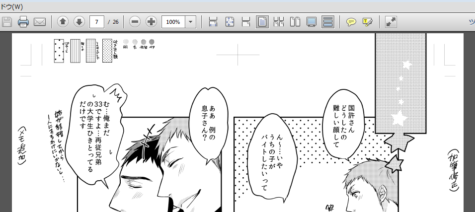 連続投稿申し訳ありません。先日リリースされました PDF入出力プラグインについてですが、こちらでの報告でよろしかったでしょうか? 早速書き出しテストの為複数回書き出しを試してみましたが、 どうしてもサイズが小さく書きだされてしまうようなのですが個別に設定等あるのでしょうか? CLIP STUDIO PAINT EXにて作成した解像度600のモノクロ漫画を 原寸・サイズ指定・解像度指定等でいくつか試してみましたが、全て同じサイズ(横幅・縦幅変わらず) で書きだされてしまいます。友人と別環境にてテストしてみましたが同様に サイズが変わらないということなのですが、こちらはバグなのでしょうか? ▼各種書き出し表示 ![]() 出力サイズ指定等も試してみましたが、必ず以下のように100%表示が 作成サイズと違うサイズとなってしまい、解像度やサイズが反映されません ▼書き出しPDF100%表示 ![]() ▼作画中25%表示 ![]() 上図のようにこちら作成元データの25%縮小位のサイズになってしまうようです。 作成ソフトは元々クリスタEXの為、要因が解らず困っておりますので お手数ですが解決方法等ありましたらご指南頂ければ幸いです。 お忙しい中たくさんの機能追加、改善ありがとうございます。 ------------------------------------------------------------ ■バージョン: ※[ヘルプ]メニュー → [バージョン情報]で確認できます。 ■グレード DEBUT( ) PRO( ) EX( ◯ ) ■OS Windows XP( ) Windows Vista( ) Windows 7 ( ◯ ) Windows 8( ) Windows 8.1( ) MacOS X 10.5( ) MacOS X 10.6( ) MacOS X 10.7( ) MacOS X 10.8( ) MacOS X 10.9( ) MacOS X 10.10( ) その他( ) ------------------------------------------------------------ |