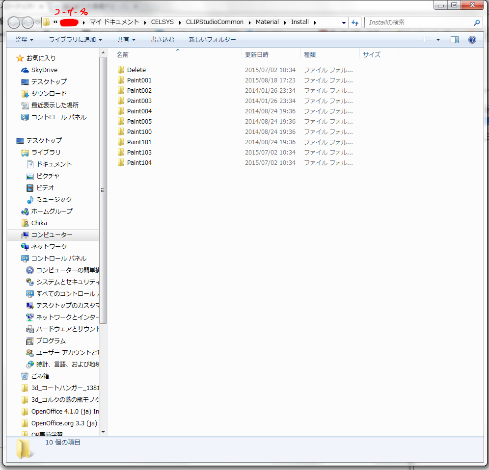 C:\Users\(お客様のユーザー名)\Documents\CELSYS\CLIPStudioCommon\Material\Install