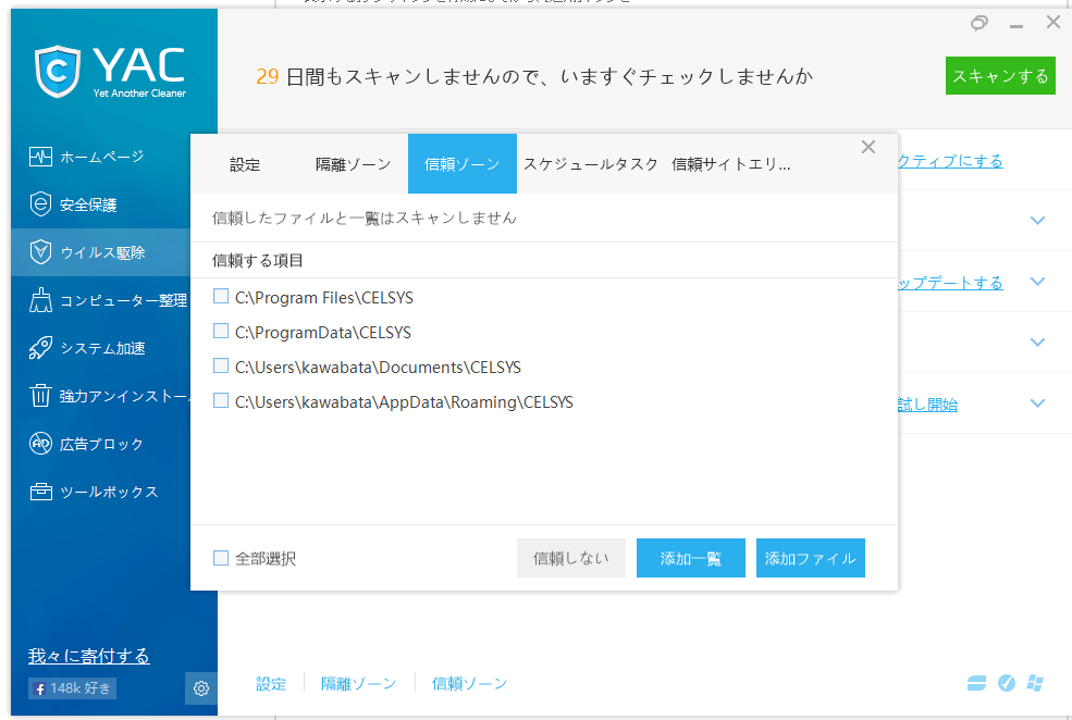 また、セキュリティソフトをご使用の場合には、以下の4つのフォルダを