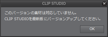 いくつか素材をダウンロードし、素材の整理をしようとしたところ、1つだけサムネイルが表示されないものがありました。 素材の中身を確認しようとすると「このバージョンの素材は対応していません。CLIP STUDIOを最新版にバージョンアップしてください。」というダイアログが出てきて詳細を確認することができず、フォルダ移動や削除しようとするとCLIP STUDIOがフリーズしてしまいます。 最新版にバージョンアップもしているのですが改善されません。