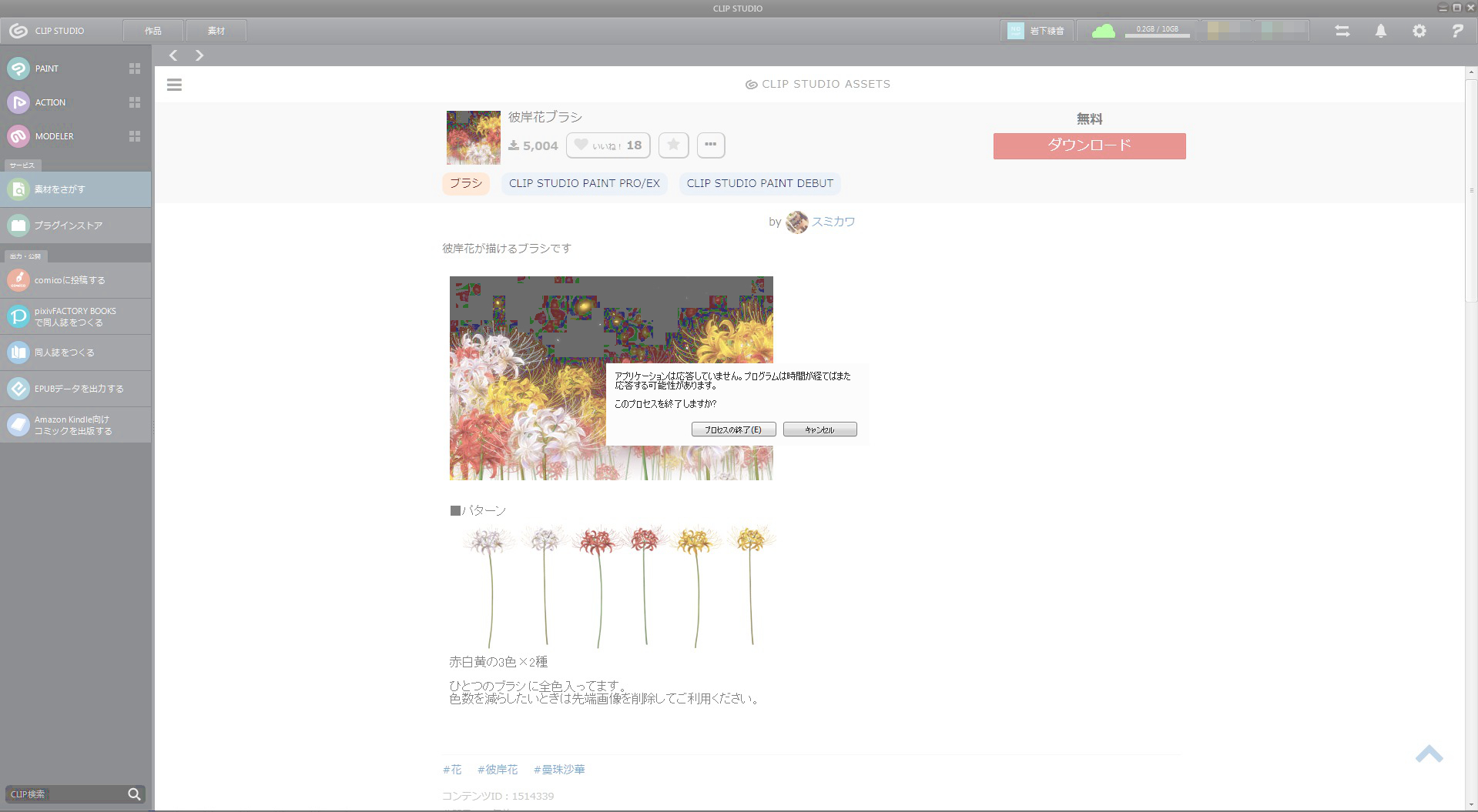 素材を探しているとき、スクロールして下の方に表示される部分(添付画像の赤枠部分)を、うっかりクリックしたところ 「アプリケーションは応答していません。プログラムは時間が経てばまた応答する可能性があります。 このプロセスを終了しますか?」という エラーが表示され動作がおかしくなり、以降正常な動作ができなくなりました。 一応再起動で直りましたが、高い確率で再現し、その都度不具合の挙動も毎回異なります。 意図しない素材ページに飛ばされたり、頻繁にプチプチとフリーズしたりスクロール出来ない状態になったりします。