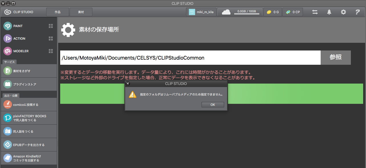 素材の保存先の変更ができない |