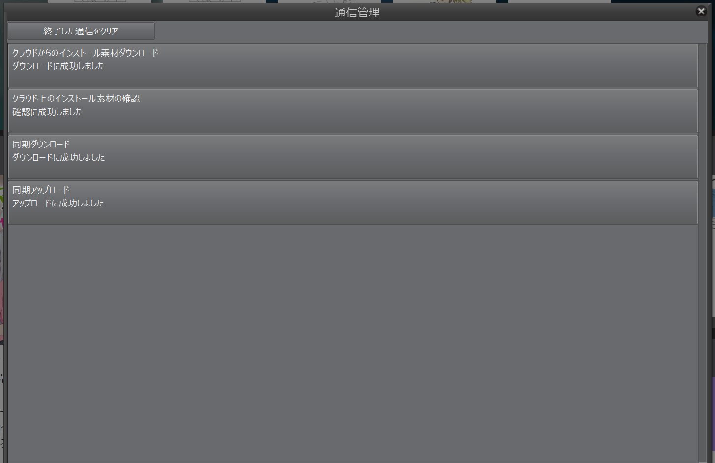 「クラウドデータの完全同期」を行い、「通信管理」を確認するとアップロードとダウンロードは全て成功した状態になっていました。![]() ところがその後、作品ファイルを開こうとすると「この作品は完全にダウンロードされていません。クラウドよりダウンロードを行いますか?」というメッセージが出ます。 ![]() 「クラウドデータの完全同期」では作品ファイルは同期されないという事なのでしょうか? それとも、作品が完全にダウンロードされていなくても「同期が成功しました」と表示されてしまうのでしょうか? ------------------------------------------------------------ ■バージョン: ※右上の[?]アイコンをクリック後に[バージョン情報]で確認できます。 ■OS Windows XP( ) Windows Vista( ) Windows 7 ( ) Windows 8( ) Windows 8.1( ) Windows 10( ○ ) MacOS X 10.5( ) MacOS X 10.6( ) MacOS X 10.7( ) MacOS X 10.8( ) MacOS X 10.9( ) MacOS X 10.10( ) MacOS X 10.11( ) mac OS 10.12( ) その他( ) ------------------------------------------------------------ |