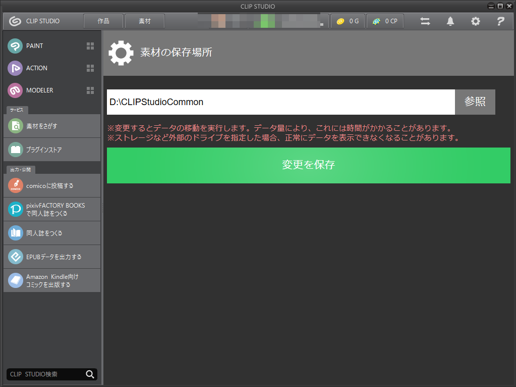 ・[CLIP STUDIO]右上の[歯車マーク]をクリックし[素材の保存場所]を選択