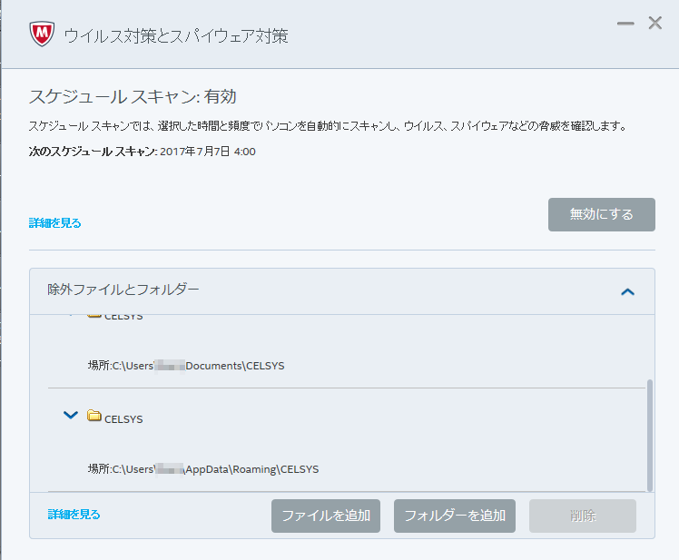 また、セキュリティソフトをご使用とのことですので、以下の4つのフォルダを