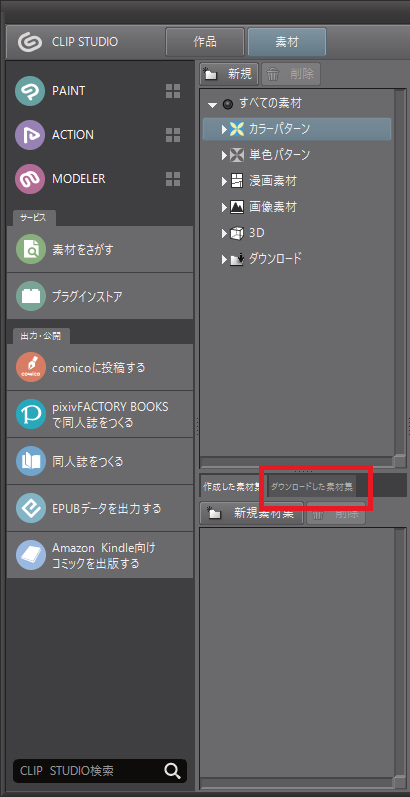 1.CLIP STUDIOを起動し、左上の[素材]→[ダウンロードした素材集]