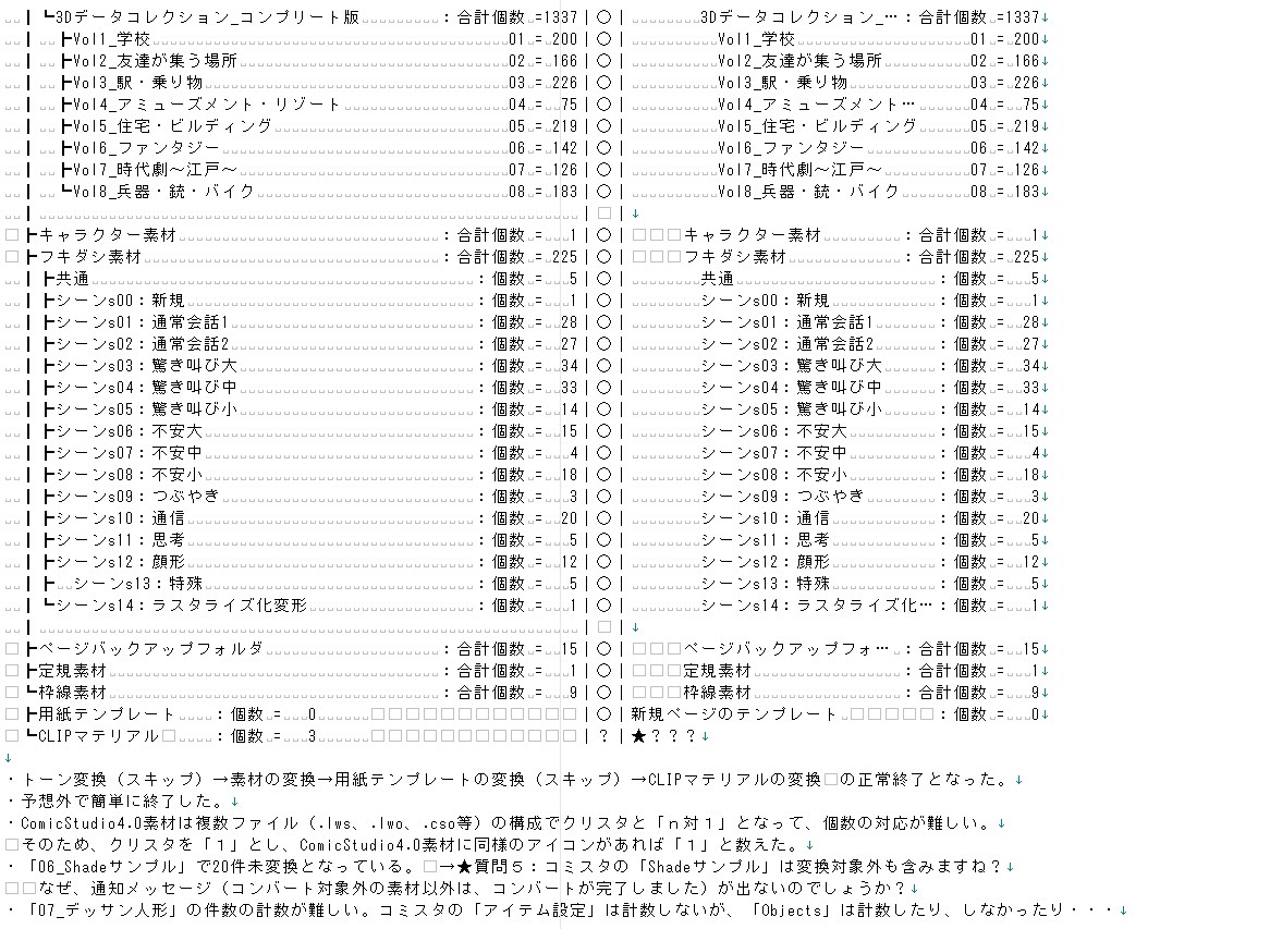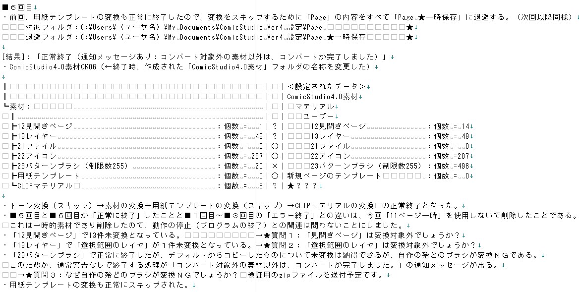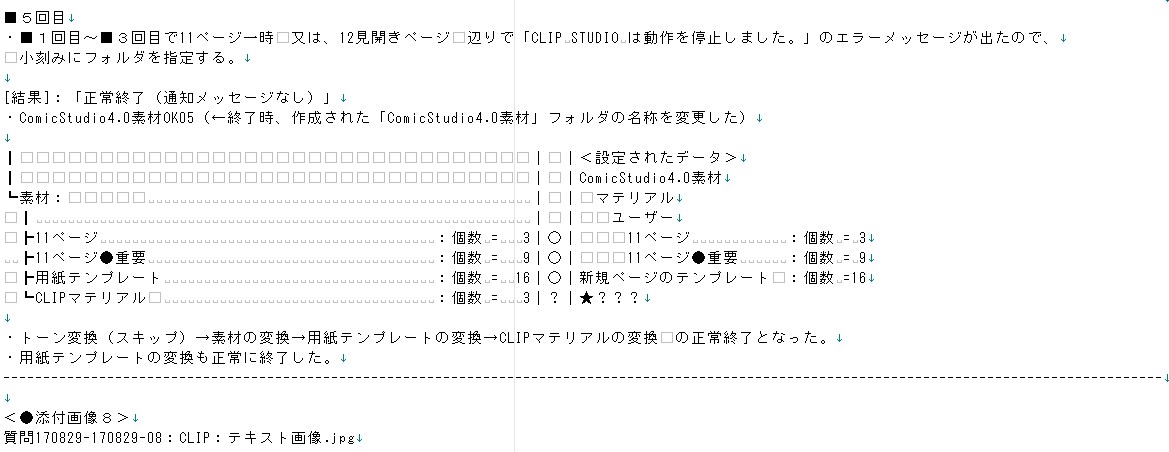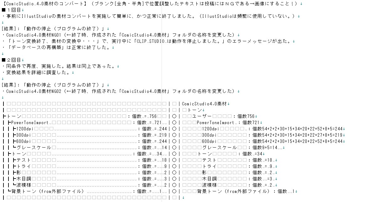 いつもお世話になっています。【BigField】と申します。 コミスタからクリスタへ移行中のユーザです。 移行作業で動作の停止(プログラムの終了)となりました。 検証作業でいくつかの疑問があり質問をしました。 質問への回答のお願いと経過報告の内容に誤りがあれば指摘してください。 以上、よろしくお願いします。 ![]() ![]() ![]() ![]() ------------------------------------------------------------ ■バージョン:V1.6.4 ※右上の[?]アイコンをクリック後に[バージョン情報]で確認できます。 ■OS Windows XP( ) Windows Vista( ) Windows 7 ( ○ ) Windows 8( ) Windows 8.1( ) Windows 10( ) MacOS X 10.5( ) MacOS X 10.6( ) MacOS X 10.7( ) MacOS X 10.8( ) MacOS X 10.9( ) MacOS X 10.10( ) MacOS X 10.11( ) mac OS 10.12( ) その他( ) ------------------------------------------------------------ |