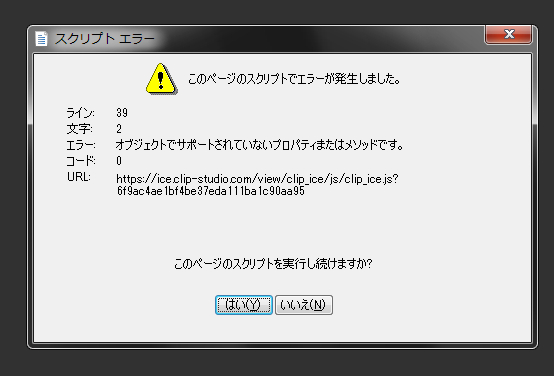 CLIP STUDIOを起動すると添付画像のようなエラーと、 ライン 0 文字 0 エラー Script error コード 0 URL https://platform.twitter.com/widgets/js というスクリプトエラーが必ず表示されます。 ![]() ------------------------------------------------------------ ■バージョン: ※右上の[?]アイコンをクリック後に[バージョン情報]で確認できます。 ■OS Windows XP( ) Windows Vista( ) Windows 7 ( ○ ) Windows 8( ) Windows 8.1( ) Windows 10( ) MacOS X 10.5( ) MacOS X 10.6( ) MacOS X 10.7( ) MacOS X 10.8( ) MacOS X 10.9( ) MacOS X 10.10( ) MacOS X 10.11( ) mac OS 10.12( ) その他( ) ------------------------------------------------------------ |