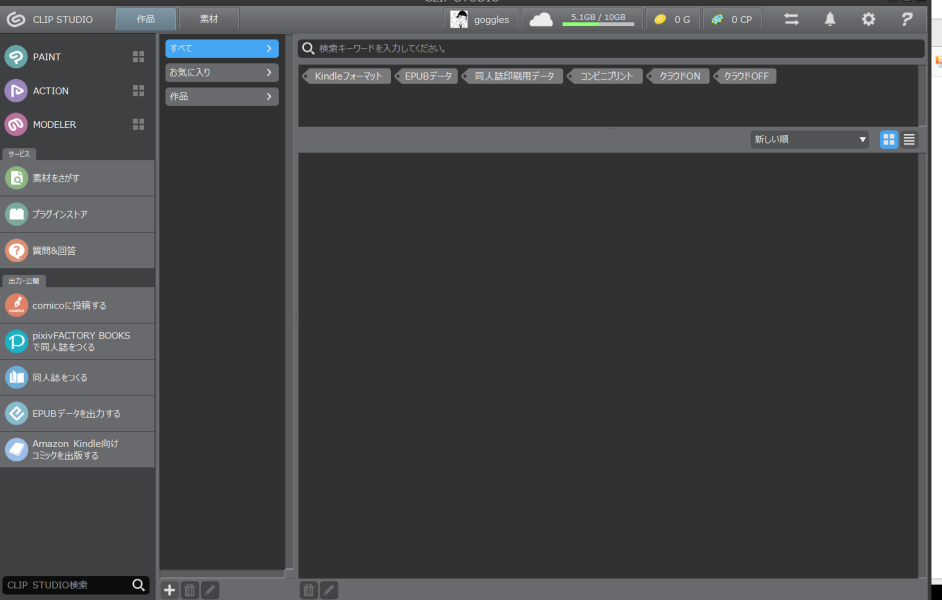 ・新規に1ページの作品を作成し、保存して、CLIP STUDIOの作品一覧で