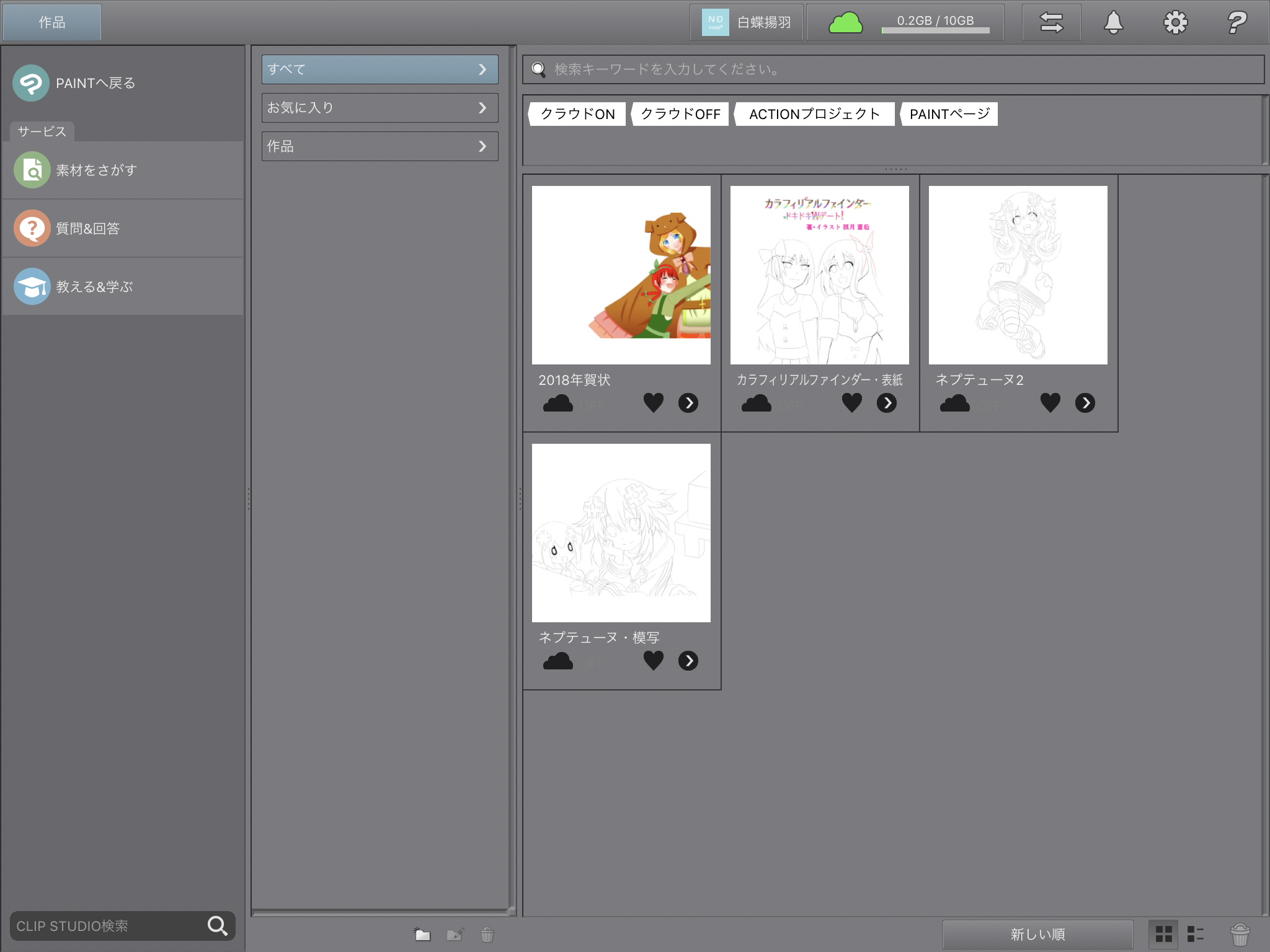 CLIP STUDIOの[作品]をタップして表示されている画面