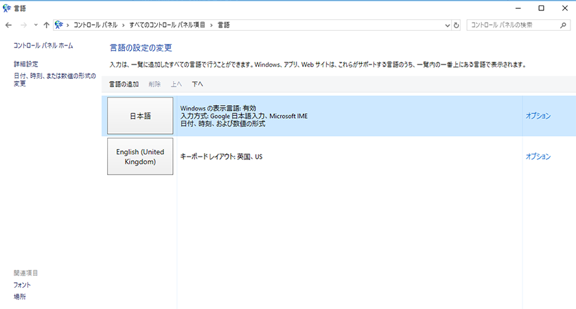 3コントロールパネル→言語 のスクリーンショット