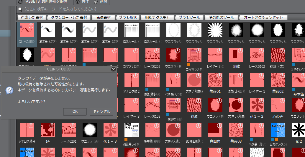 行った事は、下図にある様なクラウドでエラーが出ている素材をダブルクリックしリカバリーし 同期をしてからです。 ただ、その後に歯車マーク→追加素材を今すぐダウンロードする、と行ったのが理由なのか 一度リカバリーで戻した素材が再度赤くなってしまっています(同期できていなかった)