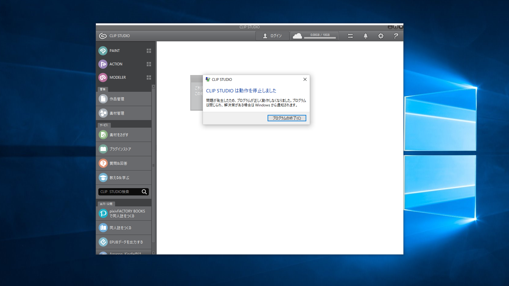 いつも快適に使わせていただいています。 先日、CLIP STUDIO起動したところ「CLIP STUDIOは動作を停止しました」の警告が表示され、起動しなくなりました。 なんとかCLIP STUDIO PAINTを開くことは出来たものの、CLIP STUDIOが開かないため素材をダウンロードすることが出来なくなってしまい困っています。 ソフトの再インストール、タブレットドライバの削除、を実施しましたが改善されませんでした。 CLIP STUDIO PAINTのバージョンは1.74 タブレットはWacom製Intuos comic タブレットドライバーは6.3.17-3 Windows10 Windows Updateは最新の状態です。 よろしくお願いします。 ------------------------------------------------------------ ■バージョン: ※Windows/MacOSXは、右上の[?]アイコンをクリック後に[バージョン情報]で確認できます。 ※iPadは、PAINTの[CLIP STUDIO PAINT]アイコンをクリック後に[バージョン情報]で確認できます。 ■OS Windows XP( ) Windows Vista( ) Windows 7 ( ) Windows 8( ) Windows 8.1( ) Windows 10( 〇 ) MacOS X 10.5( ) MacOS X 10.6( ) MacOS X 10.7( ) MacOS X 10.8( ) MacOS X 10.9( ) MacOS X 10.10( ) MacOS X 10.11( ) mac OS 10.12( ) mac OS 10.13( ) iOS 11( ) その他( ) ------------------------------------------------------------ |
