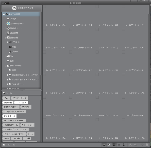 現象が起きているのは画像素材のブラシフォルダだったため、上記の生成されたファイルを一覧から削除後、 https://www.clip-studio.com/clip_site/support/request/detail/svc/66/tid/95638 を参考に、iPadの同期を一旦offにしてから、PCの方からすべてのクラウド素材を削除し、バックアップしていた素材を復元して再度素材の同期をonにしました。 結果がこちらです。 同期前にすべての素材を検索しましたが、「レースブラシ」という素材はもう存在しないはずでした……。 クラウド上に削除しきれず残っているのではないかと考えています。 ユーザー側でクラウドのファイルを直接操作できないようなので、該当のファイルをそちらで削除していただけませんでしょうか。 またこの事象の原因が判明しているのであれば教えていただきたいです。