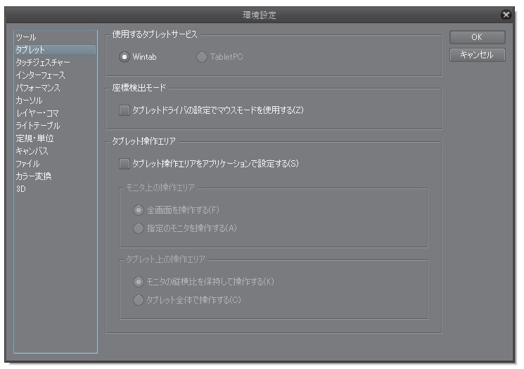 表示される画面左側で[タブレット]を選択した状態の画面のスクリーンショット