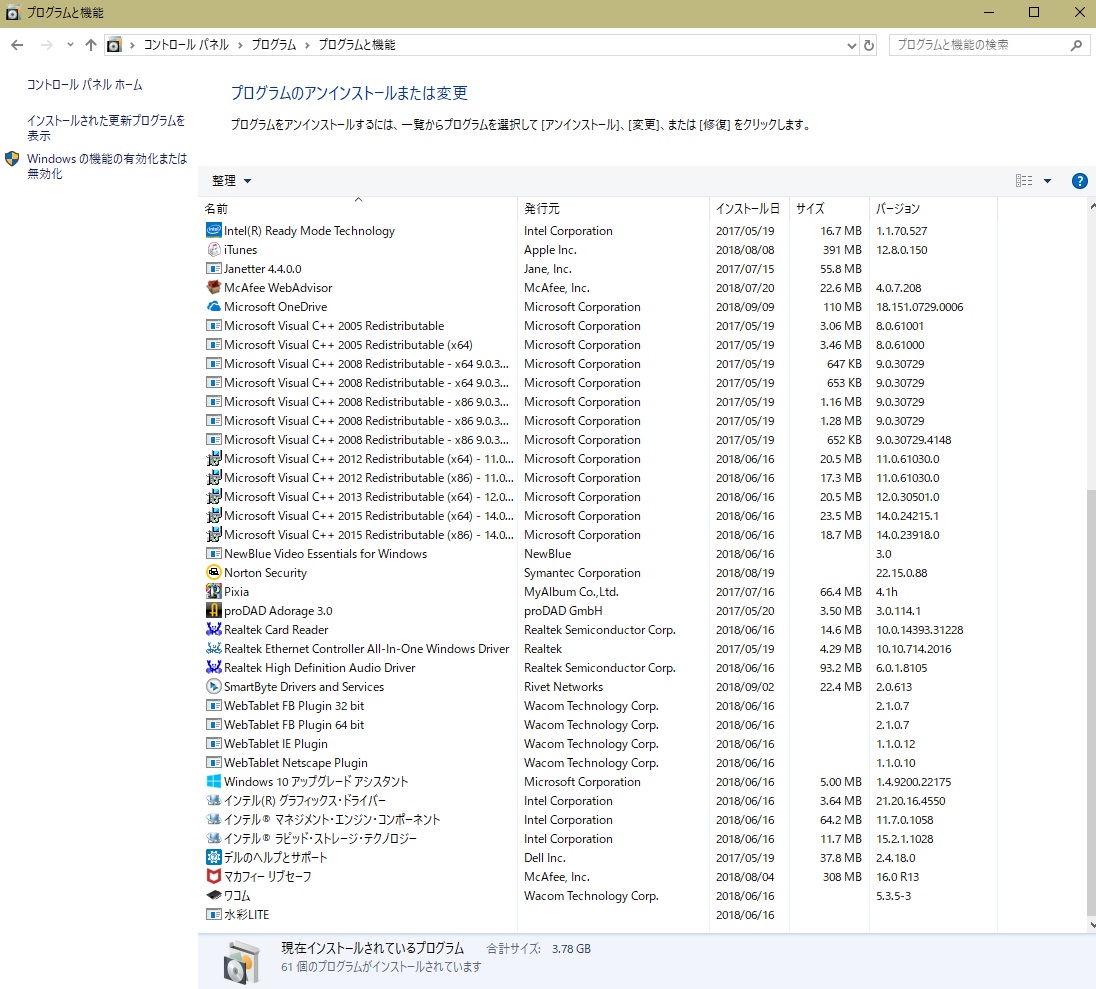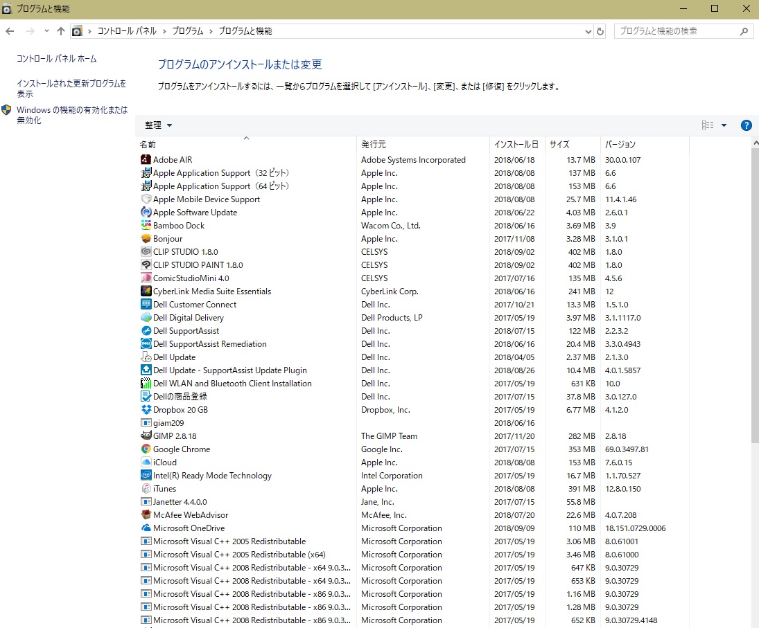 (プログラムと機能)]を選択して表示される画面のすべての項目が