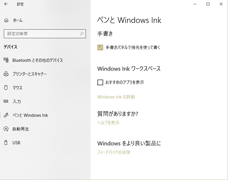 左側で[ペンとWindows Ink]の順に選択すると表示されるページのすべての