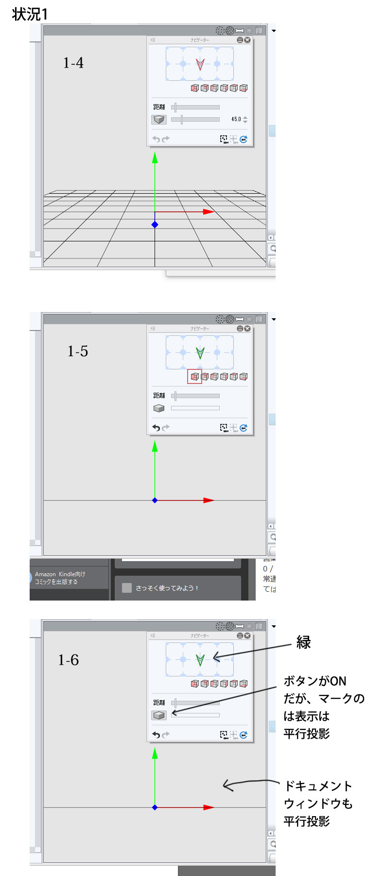 CLIP STUDIO MODELER 1.6.3 Windows10 64bit 3D素材セットアップモード(3Dオブジェクト作成、3D背景作成、3Dキャラクター作成)において、 ナビゲーターパレットやカメラ設定パレットの 平行投影/透視投影のボタンによる投影の切り替え動作が、視点変更ボタンとの併用時に 手順によってはうまく動作しません。 形状作成モードでは正しく動作します。 ご確認をよろしくお願いします。 ------------------------------------ 【状況1】 (1)CLIP STUDIO 起動 (2)ランチャーからMODELER起動 (3)新規>3Dオブジェクトor3D背景、3Dキャラクター選択 (4)新規3Dオブジェクト作成モード。 この時点でナビゲーターコントロールに表示される カメラの方向を示すマークは赤色=透視投影の状態です。 (5)視点変更の正面図を選択します。 カメラの方向を示すマークは緑色=平行投影になります。、 ドキュメントウインドの表示も平行投影になります。 (6)平行投影/透視投影の切り替えボタンを押します。 ボタンが押された状態になりますが、 ボタンの表示は平行投影のままであり、ドキュメントウィンドウの表示も平行投影の状態になり うまく切り替えがおこなわれません。 ![]() 【状況2】 状況1の(4)までと同じ (2-5)平行投影/透視投影の切り替えボタンを押します。 ボタンがおされてない状態になり、平行投影になります。 ナビゲーターのマークは赤色、ドキュメントウィンドウも平行投影です。 (2-6) 視点変更ボタンの正面図を選択します。 ナビゲーターのマークは緑色になります (2-7) 平行投影/透視投影の切り替えボタンを押します。 ボタンが押された状態になり、透視投影になり正常に動作します。 ナビゲーターのマークは赤色になります。 ![]() ------------------------------------------------------------ ■バージョン: ※Windowsは、[ヘルプ]メニュー → [バージョン情報]で確認できます。 ※MacOSXは、[CLIP STUDIO MODELER]メニュー → [バージョン情報]で確認できます。 ■OS Windows XP( ) Windows Vista( ) Windows 7 ( ) Windows 8( ) Windows 8.1( ) Windows 10( ) MacOS X 10.6( ) MacOS X 10.7( ) MacOS X 10.8( ) MacOS X 10.9( ) MacOS X 10.10( ) MacOS X 10.11( ) mac OS 10.12( ) その他( ) ------------------------------------------------------------ |