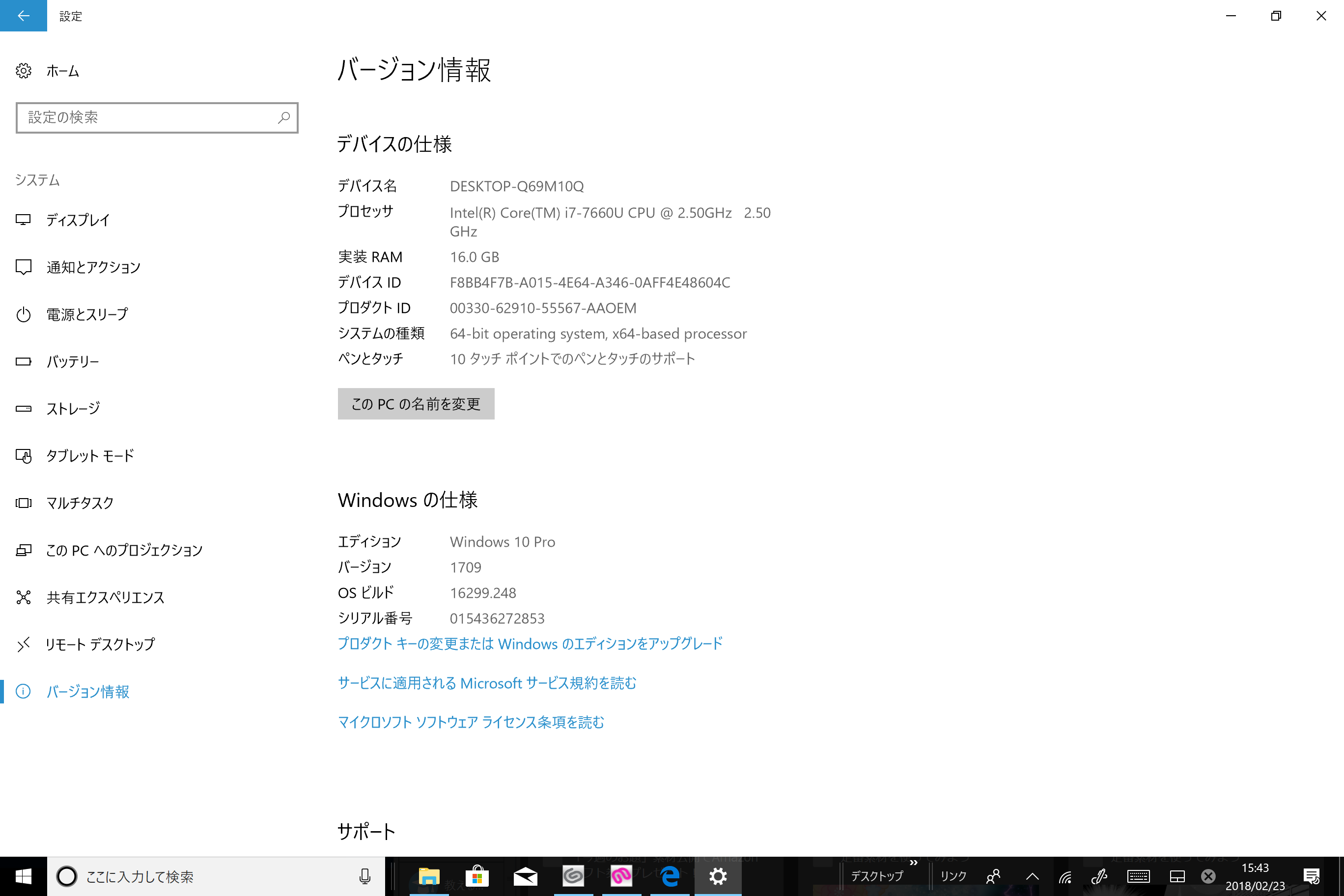 ・[Windowsスタート]→[設定]→[システム]を選択し、表示される画面の