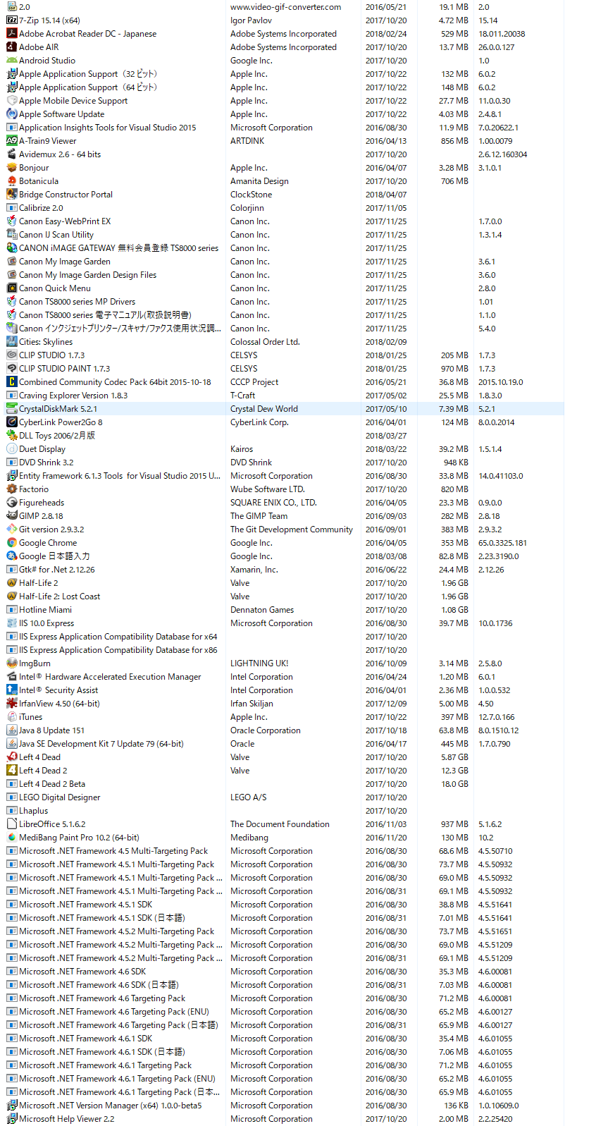 (プログラムと機能)]を選択して表示される画面のすべての項目が