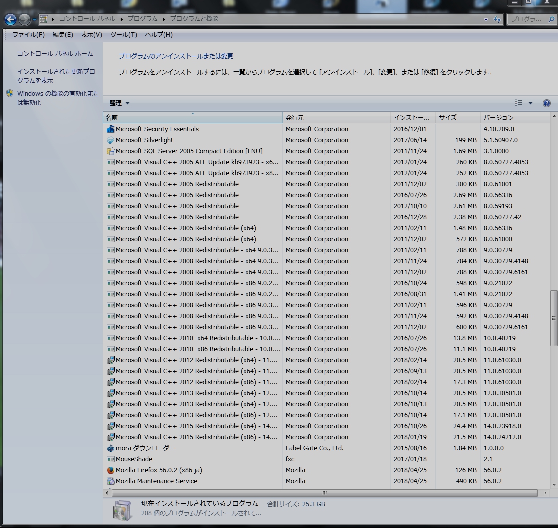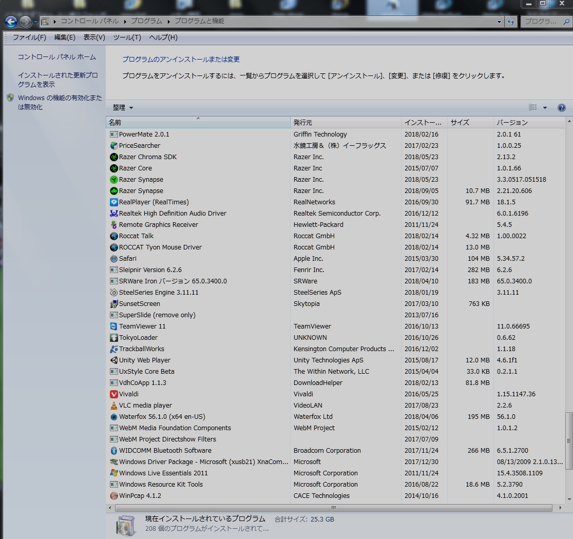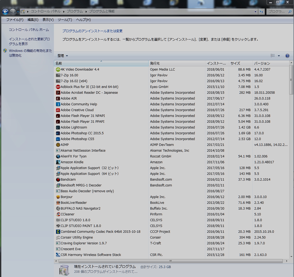 ・[コントロールパネル]→[プログラムと機能]を選択いただき、表示される一覧の