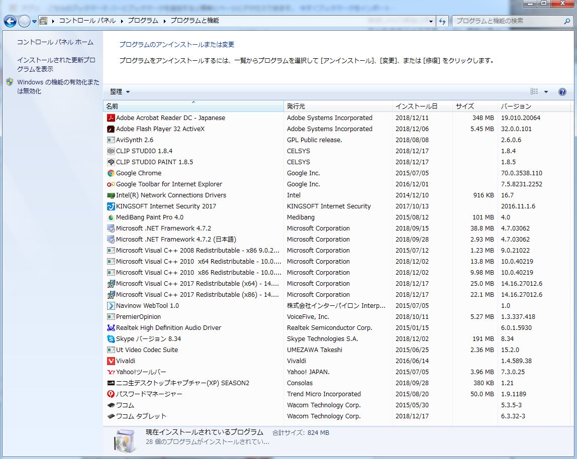 ・[Windowsスタート]→[コントロールパネル]→[プログラムのアンインストール]