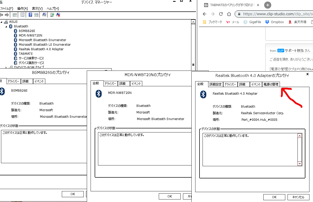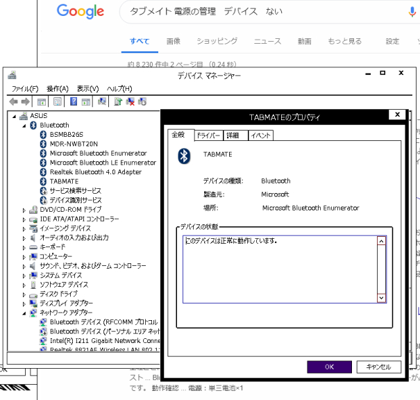 念願のタブメイトを購入したのですが、初日に使えたきりペアリングが切れるようになりました。 今ではずっと青赤ランプがチカチカしたままで接続できません 何度もインスト―ルと削除してみたのですが、ずっとこんな感じです。 (このデバイスは正常に動作していますと出ています)