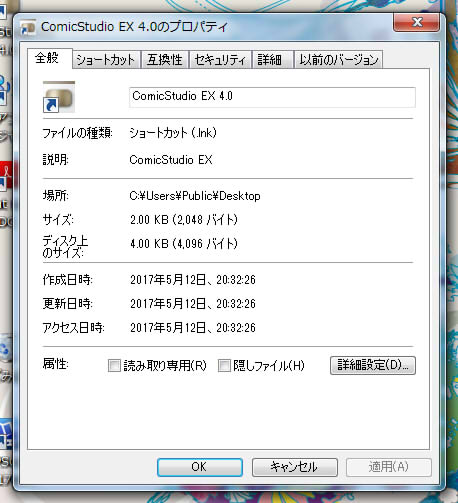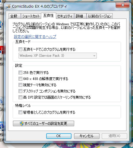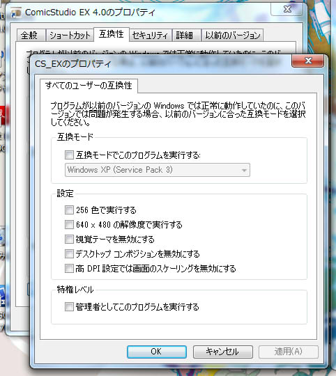 (念の為コミスタのプロパティ互換性の『管理者としての~』部分を確認しましたが、