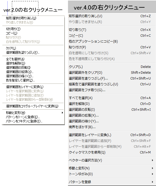 範囲選択中に、再度別の範囲選択をしようとした時、右クリック内に「範囲選択」の選択肢が出てこないのですが、それを出来るようにして頂けないでしょうか。 確かVer.2までは出来たと思います。 現状だと一度右クリックで選択を解除してからではないと出来ないので、不便というかいちいち回りくどいのです。 自分は右クリックを非常に便利に使ってますので、是非この機能を復活して欲しいです。 ------------------------------------------------------------ ■ComicStudio ComicStudioEX( 4.6.2) ComicStudioPro( ) ComicStudioMini( ) ComicStudioDebut( ) バージョン: ※[ヘルプ]メニュー→[バージョン情報]で確認できます。 ■OS Windows XP( ○ ) Windows Vista( ) Windows 7 ( ) Windows 8( ) MacOS X 10.5( ) MacOS X 10.6( ) MacOS X 10.7( ) MacOS X 10.8( ) その他( ) ------------------------------------------------------------ |