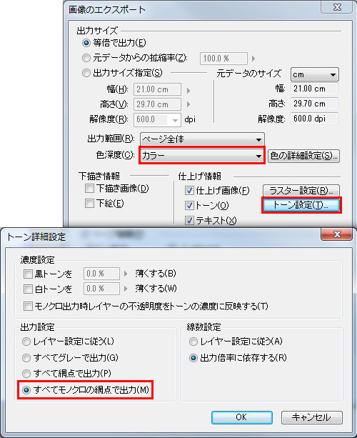 ※書き出しダイアログと、[設定]ボタン、[トーン設定]ボタンをクリックして表示する