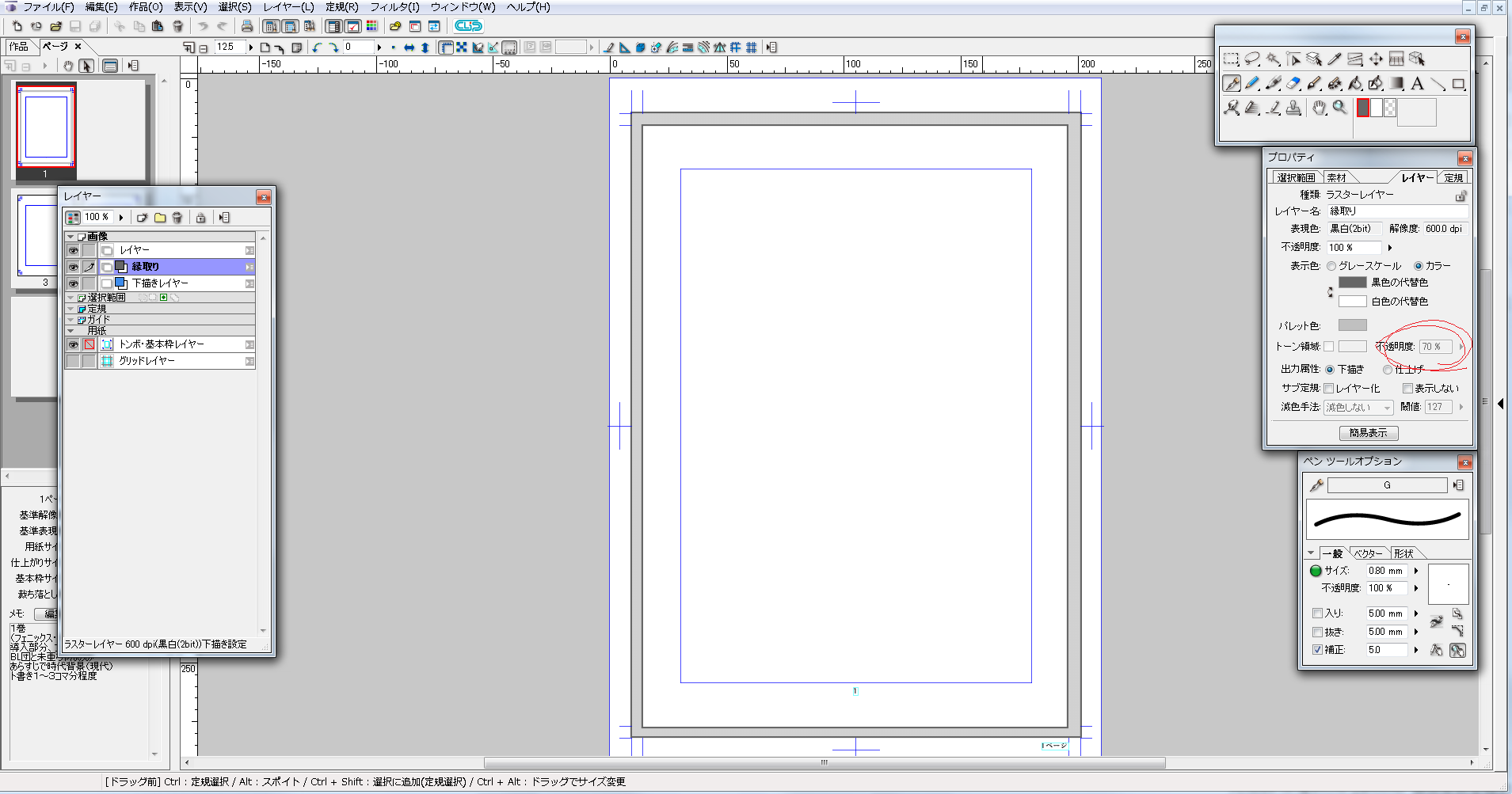 今まで書いていたページに、ペンで描いた所、不透明度が下がっている違和感でやっと気づいたような状態でした。