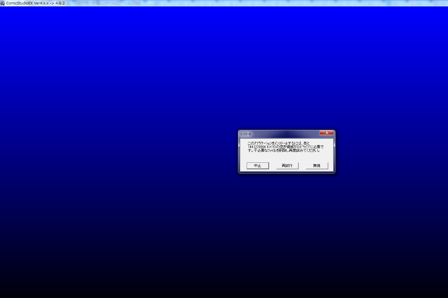 先日PCの買い替えをしたのでコミックスタジオ4.0EXをインストールしました。 最新のバージョンである4.6.2にアップデートしようとしたところ、以下のような表示が出て正しくアップデートすることができませんでした。 コミスタ本体のインストール場所は容量の大きいDドライブに移してあり、アップデートのインストール場所も説明に沿って変更・操作しましたが同じ表示が出ました。 Dドライブ自体には他のソフトも入っていますが、コンピュータのDドライブ空き領域を調べてみたところ2.65TBの空きがあったため単純に容量が足りないとは考えにくかったので質問させて頂きました。 アップデートはできませんが、起動自体は可能です。製品バージョンは4.5.1です。 また、他の似た状況の方の質問を参考にさせて頂き、一応コミックスタジオのショートカット上で右クリック→プロパティ→リンク先の部分をすべてコピーしたものの情報も載せさせて頂きます。D:\Tool\CS_EX.exeです。 よろしくお願い致します。 ![]() ------------------------------------------------------------ ■ComicStudio ComicStudioEX( ○ ) ComicStudioPro( ) ComicStudioMini( ) ComicStudioDebut( ) バージョン:4.5.1 ※[ヘルプ]メニュー→[バージョン情報]で確認できます。 ■OS Windows XP( ) Windows Vista( ) Windows 7 ( ○ ) Windows 8( ) Windows 8.1( ) MacOS X 10.5( ) MacOS X 10.6( ) MacOS X 10.7( ) MacOS X 10.8( ) MacOS X 10.9( ) その他( ) ------------------------------------------------------------ |