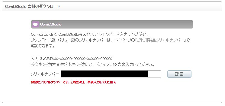ComicstudioProのダウンロード素材を利用したくてシリアルナンバーを入力したのですが、 以下のようなエラーが出てダウンロードできませんでした。 マイページの登録情報からコピペしても手入力でもできないようです。 もうサービス終了されたのでしょうか? ![]() ---------------------------------------------------- ■Webブラウザ InternetExplorer7( ) InternetExplorer8( ) InternetExplorer9( ) InternetExplorer10( ) Internet Explorer11( ) Firefox( ) Google Chrome(〇 ) Safari( ) その他( ) ■OS Windows XP( ) Windows Vista( ) Windows 7 ( ) Windows 8(〇 ) Windows 8.1( ) MacOS X 10.5( ) MacOS X 10.6( ) MacOS X 10.7( ) MacOS X 10.8( ) MacOS X 10.9( ) MacOS X 10.10( ) その他( ) ---------------------------------------------------- |