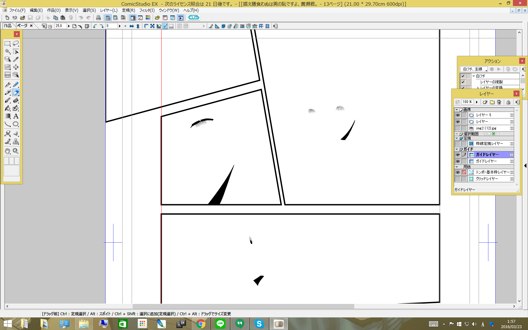 恐れ入ります。 去年の暮れに描いた原稿で、すべて完成した状態の作品なのですが、 今日ページファイルを開いてみたら一部のベタなどは表示されますが コマ割りやセリフなどほぼすべて真っ白になってしまいました。 添付画像のような状態です。 「作品」では完成した状態で表示されます。 レイヤーフォルダも確認してみましたが、レイヤー数は それなりにありましたし、1レイヤーにつき7MB以上の 容量はあるようなので、中身は残っていると思うのですが… 不具合ボードで、同じような内容でご相談されていたID:69336の方の 方法の複数レイヤーファイルを読み込む方法も試してみましたが、 まったく改善されなかったのでお手上げの状態です。 コミックスタジオを使用していてこのようなことになったのは 初めてで、今回のファイルの作業中に強制終了やエラーなどは 起こっていません。 お手数ですがご助言の方よろしくお願い致します。 ![]() ------------------------------------------------------------ ■ComicStudio ComicStudioEX( ● ) ComicStudioPro( ) ComicStudioMini( ) ComicStudioDebut( ) バージョン:4.6.2 ※Windowsは、[ヘルプ]メニュー → [バージョン情報]で確認できます。 ※MacOSXは、[ComicStudio(各グレード)]メニュー → [バージョン情報]で確認できます。 ■OS Windows XP( ) Windows Vista( ) Windows 7 ( ) Windows 8( ) Windows 8.1( ● ) Windows 10( ) MacOS X 10.5( ) MacOS X 10.6( ) MacOS X 10.7( ) MacOS X 10.8( ) MacOS X 10.9( ) MacOS X 10.10( ) MacOS X 10.11( ) その他( ) ------------------------------------------------------------ |