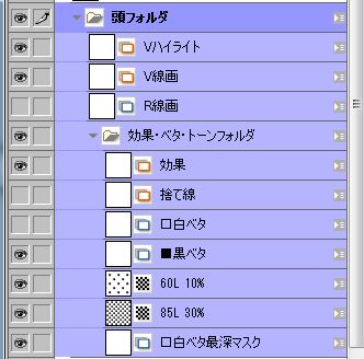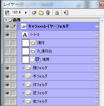 <キャラ用レイヤーフォルダの構成> なお、描画対象のオブジェクトであるキャラやメカ等はレイヤの使用がフォルダ内で完結する様に対応する専用フォルダを作っています。 こうすれば、コピー等の操作で、シーンごとの流用がしやすくなります。 そのため、問題のキャラ用レイヤーフォルダ内の2番目の「効果・ベタ・トーンフォルダ」は多数存在することになります。