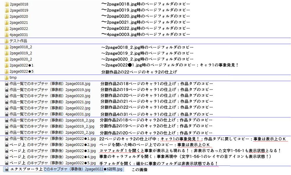 ・大変ですが次回、ページが完成した時にエクスプローラでその都度フォルダページを一旦コピーして、 発生した時にそのフォルダページを再コピーします。 ・事象前後の二つのpage00xxフォルダのpage.cpgを開いて、作品情報の非表示、事象外のコマやレイヤを削除します。 できるだけネタばれやストーリヒントの拡散防止をしたいと思います。(老婆心ながら)
