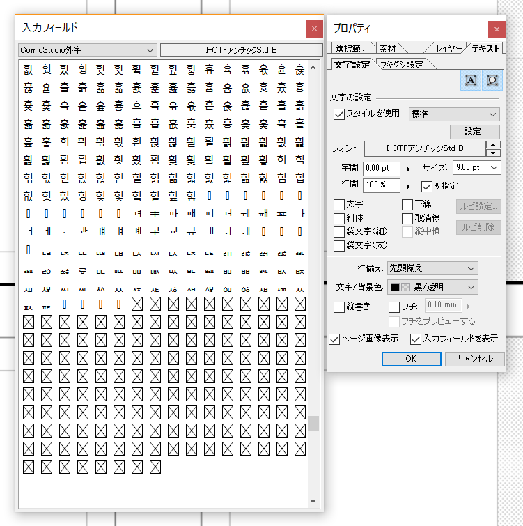 テキストの入力フィールドを表示した際、ハングル文字が固定で表示されるようになってしまいました。 手動でComicStudio外字を選んで使うことはできますが、その後ComicStudio外字を選択したまま閉じて、また入力フィールドを開くとハングル文字が表示されてしまいます。 入力フィールドを表示したとき、画像のようにComicStudio外字が選択されているにも関わらずハングル文字が表示されている状態です。 直す方法を教えてください。 ![]() ちなみに、Shiftをクリックしたままアプリケーションを起動して「テキスト」のみ初期化するというのをすでに試しましたが、改善は見られませんでした。 宜しくお願いいたします。 ------------------------------------------------------------ ■ComicStudio ComicStudioEX( 〇 ) ComicStudioPro( ) ComicStudioMini( ) ComicStudioDebut( ) バージョン:4.6.2 ※Windowsは、[ヘルプ]メニュー → [バージョン情報]で確認できます。 ※MacOSXは、[ComicStudio(各グレード)]メニュー → [バージョン情報]で確認できます。 ■OS Windows XP( ) Windows Vista( ) Windows 7 ( ) Windows 8( ) Windows 8.1( ) Windows 10( 〇 ) MacOS X 10.5( ) MacOS X 10.6( ) MacOS X 10.7( ) MacOS X 10.8( ) MacOS X 10.9( ) MacOS X 10.10( ) MacOS X 10.11( ) mac OS 10.12( ) その他( ) ------------------------------------------------------------ |