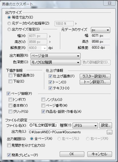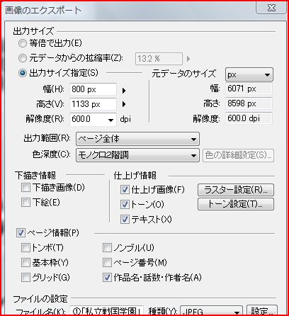 おそらく不具合ではなく操作ミスの質問で、心苦しいのですが… きちんとした画像で書き出しができる方法を、お教えいただけたら幸いです。 何卒、よろしくお願いいたします。 ------------------------------------------------------------ ■ComicStudio ComicStudioEX( ) ComicStudioPro( ○ ) ComicStudioMini( ) ComicStudioDebut( ) バージョン: ※Windowsは、[ヘルプ]メニュー → [バージョン情報]で確認できます。 ※MacOSXは、[ComicStudio(各グレード)]メニュー → [バージョン情報]で確認できます。