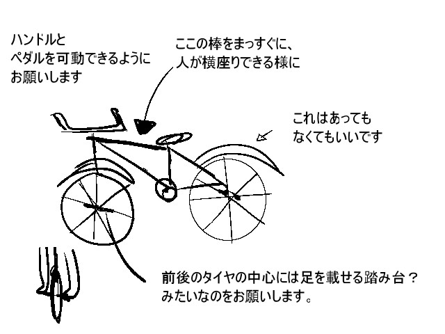 ![]() 絵が雑ですみません。 Pose studioようにFBXやOBJやLWOでフォーマットはかまいませんのでハンドルとペダル可動マウンテンバイクをお願いします。 既にいくつかありますが、ママチャリや、デザイン的に求めているのとは違うのでリクエストさせてください。 二人乗りができるように、真ん中?の横の棒をまっすぐに、そして太すぎず細すぎず。 こちらのウェブにあるような感じのに、タイヤに足場をつけ確か感じでお願いします。 よくマウンテンバイクSHOWなどで、その足場を利用して、バイク全体を回転させたりする技があるじゃないですか?それをやるためにお願いします。 サドル、ハンドルのデザインはお任せします。ブレーキ付きでお願いします。 |