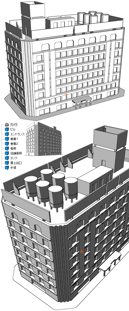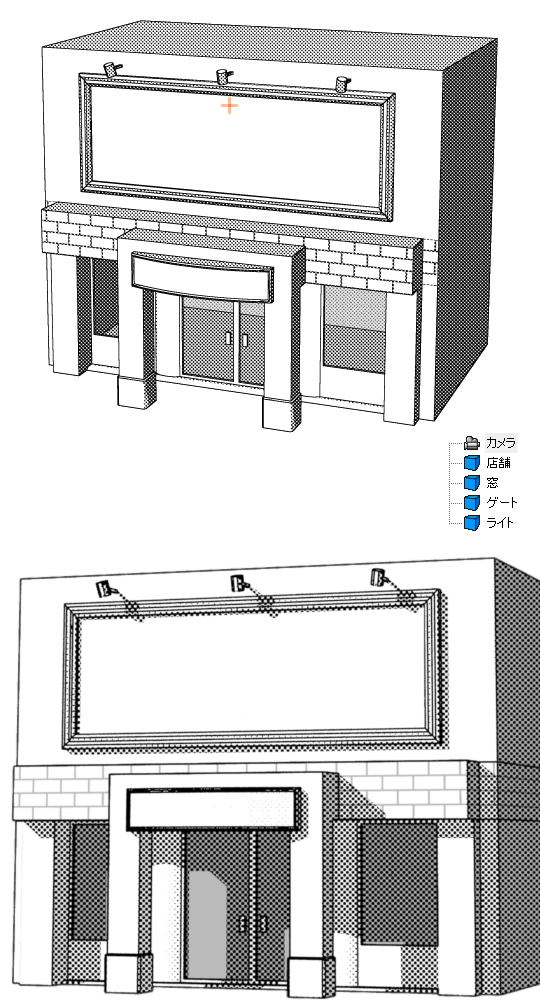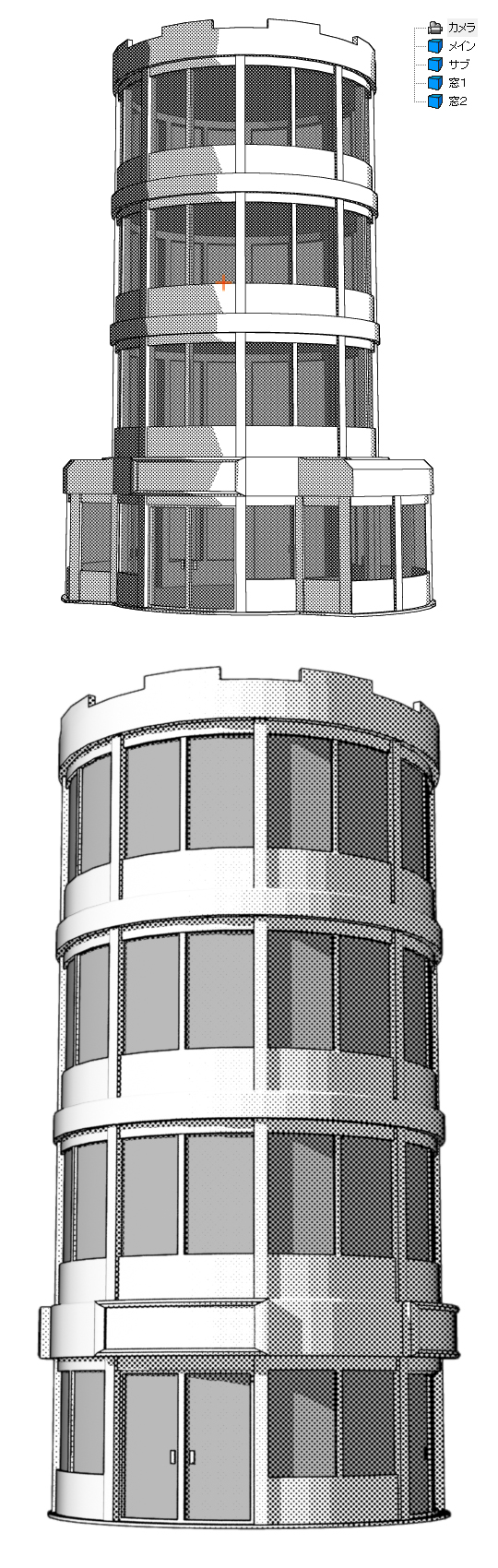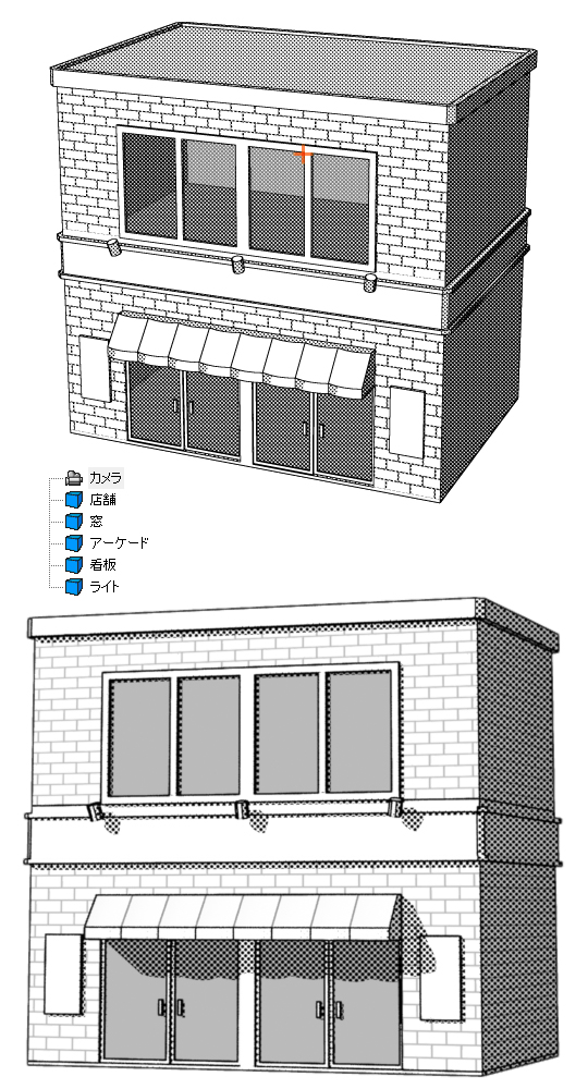 レンガ部分はテクスチャですが、レンダリングするとトーン扱いになる為、